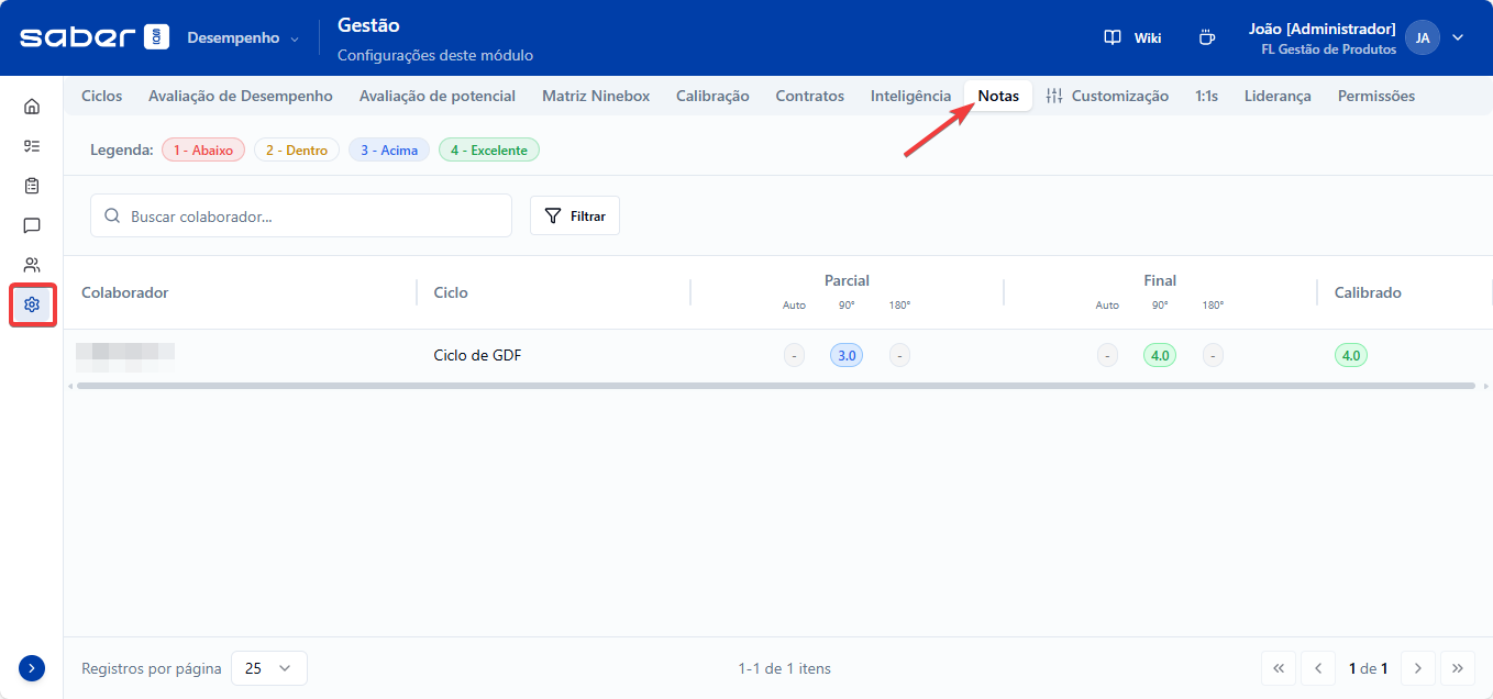 A aba de Notas dentro do painel de Gestão funciona como o boletim consolidado de toda a empresa. É neste local que o RH e a diretoria conseguem ter uma visão rápida e comparativa de todos os resultados gerados no ciclo de desempenho, acompanhando as notas parciais, as notas finais e os resultados já calibrados de cada colaborador.