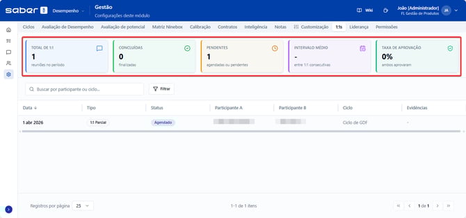A aba de 1:1s dentro do painel de Gestão é o painel de controle para acompanhar a frequência e a saúde das reuniões individuais na sua empresa. É aqui que o RH e a diretoria conseguem monitorar se os líderes estão, de fato, engajados no desenvolvimento contínuo das suas equipes através de conversas periódicas.