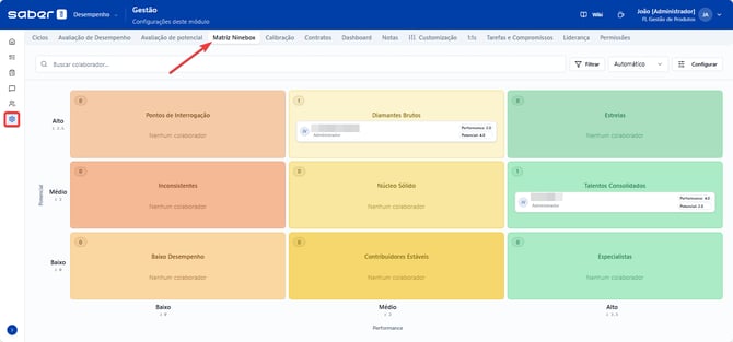 No menu lateral esquerdo, clique em Gestão (ícone de engrenagem), selecione a aba Matriz Ninebox
