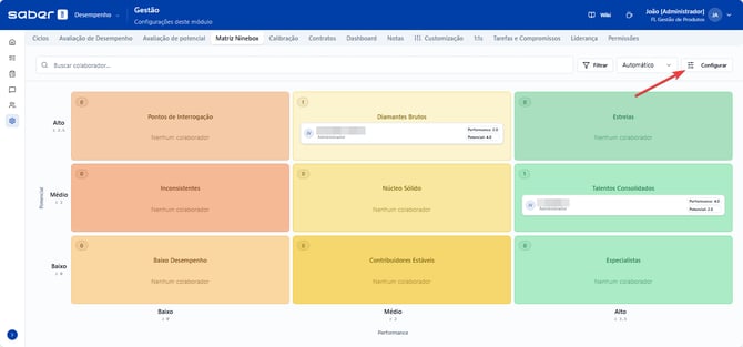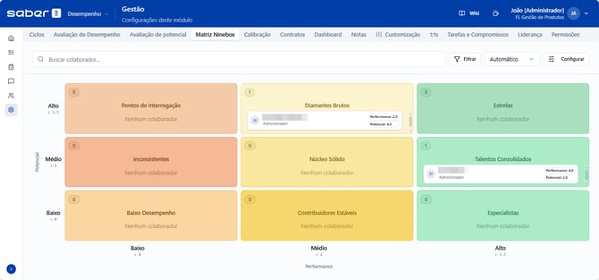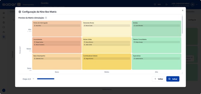 Com a configuração salva, a matriz passará a cruzar as notas reais da sua equipe, posicionando cada colaborador automaticamente em uma das nove caixas.