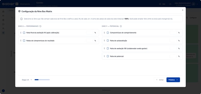Eixo X (Performance) e Eixo Y (Potencial): Selecione as caixinhas dos itens que irão compor a nota de cada eixo (ex: Nota final da avaliação, Compromissos, etc).