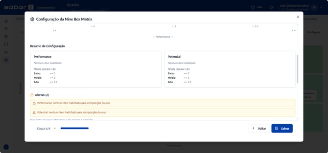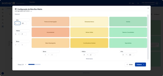 Aqui você define as notas de corte. É o momento de dizer ao sistema o que é um desempenho ou potencial Baixo, Médio e Alto.