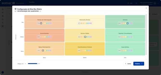 Deixe a matriz com a cara da sua empresa! Nesta etapa, você pode personalizar a cor de cada uma das 9 caixas e alterar o nome , ajudando na identificação visual (ex: tons de verde para os quadrantes de alto desempenho e tons de vermelho/laranja para os de atenção).
