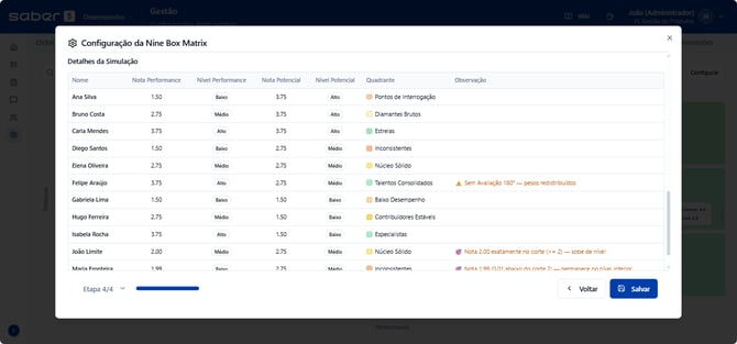 Detalhes da Simulação: O sistema gera uma tabela com dados fictícios para simular como os colaboradores cairiam nos quadrantes com base na sua régua. Ele inclusive exibe alertas caso uma nota caia exatamente na linha de corte, mostrando para onde a pessoa vai. Assim, você tem certeza de que a matemática está certa antes de salvar!