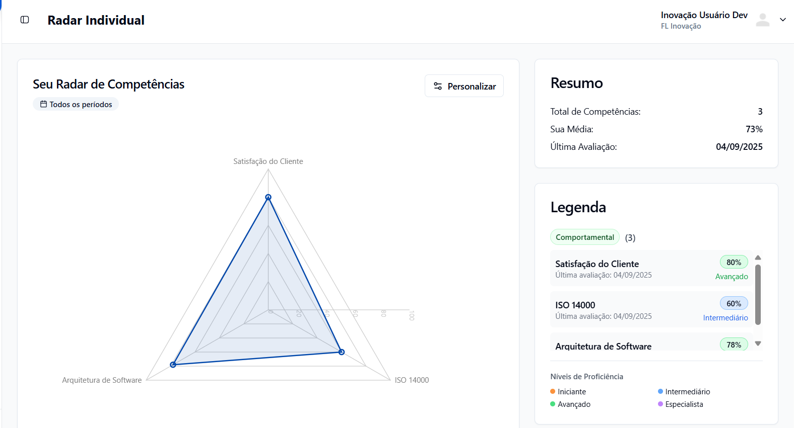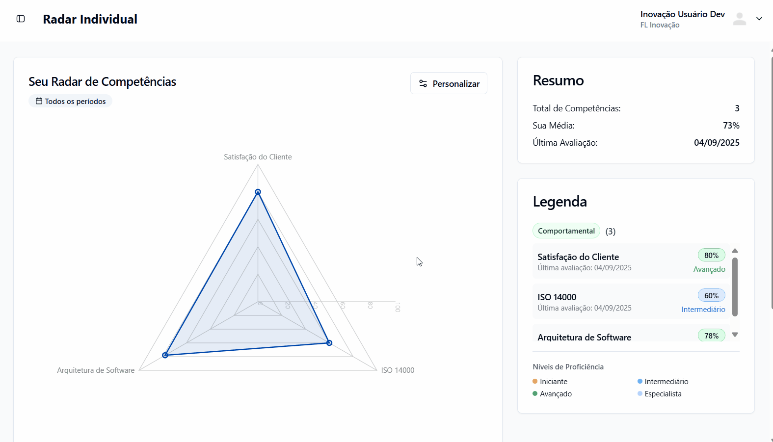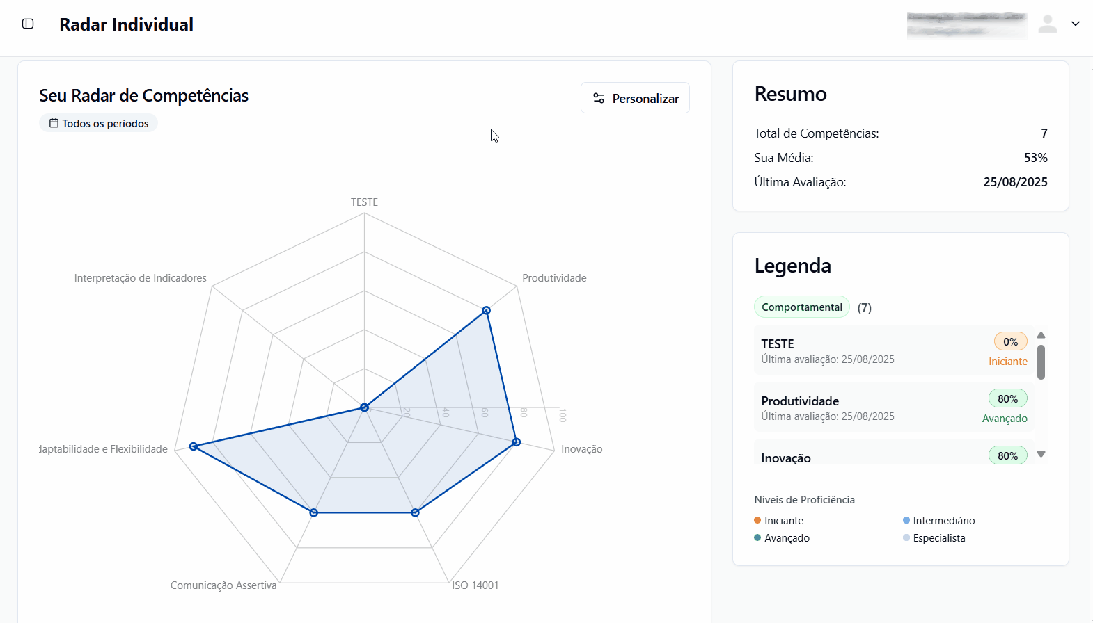 O Radar Individual está localizado na primeira aba do módulo Competências e apresenta: