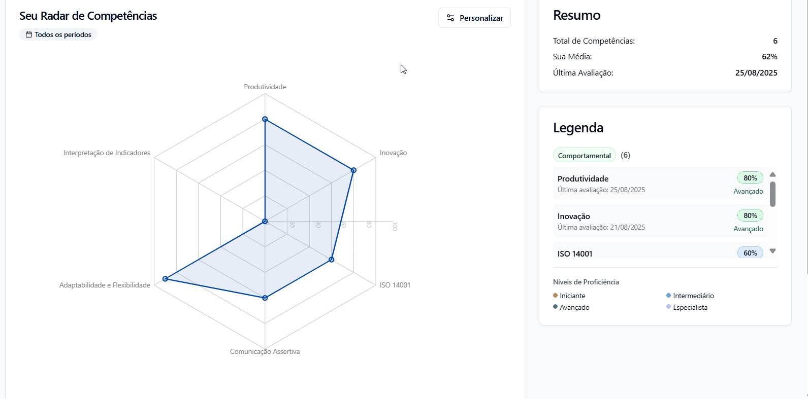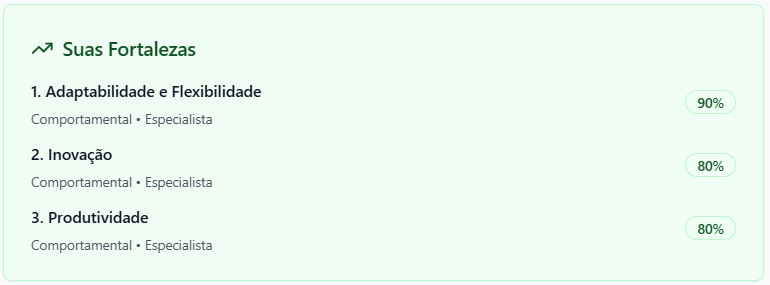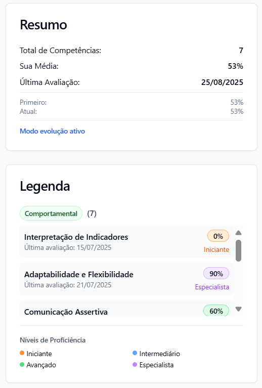 - Autoconhecimento: Visualize rapidamente suas forças e áreas de melhoria