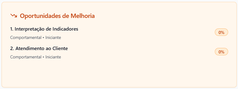 - Iniciante (0-25%): Conhecimento básico, precisa de supervisão constante