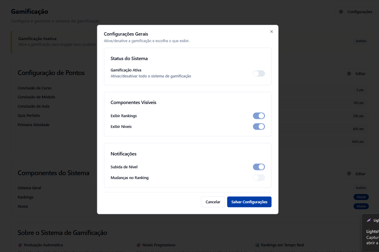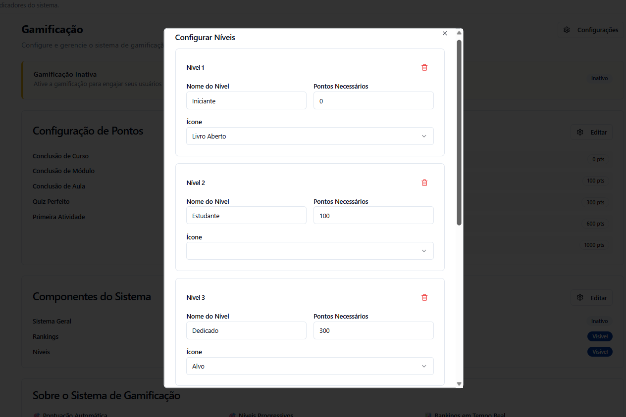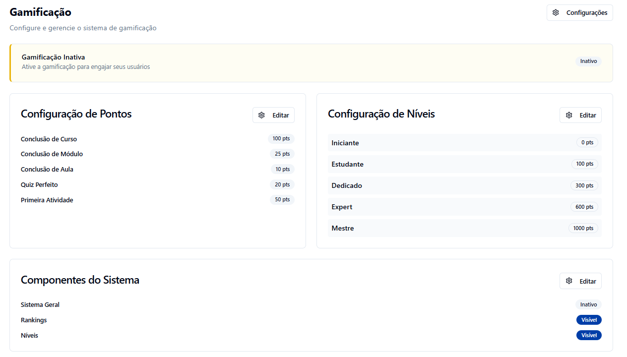 💡 Dica: Mesmo com a gamificação inativa, você pode pré-configurar pontos e níveis e ativar o sistema somente quando tudo estiver revisado.
