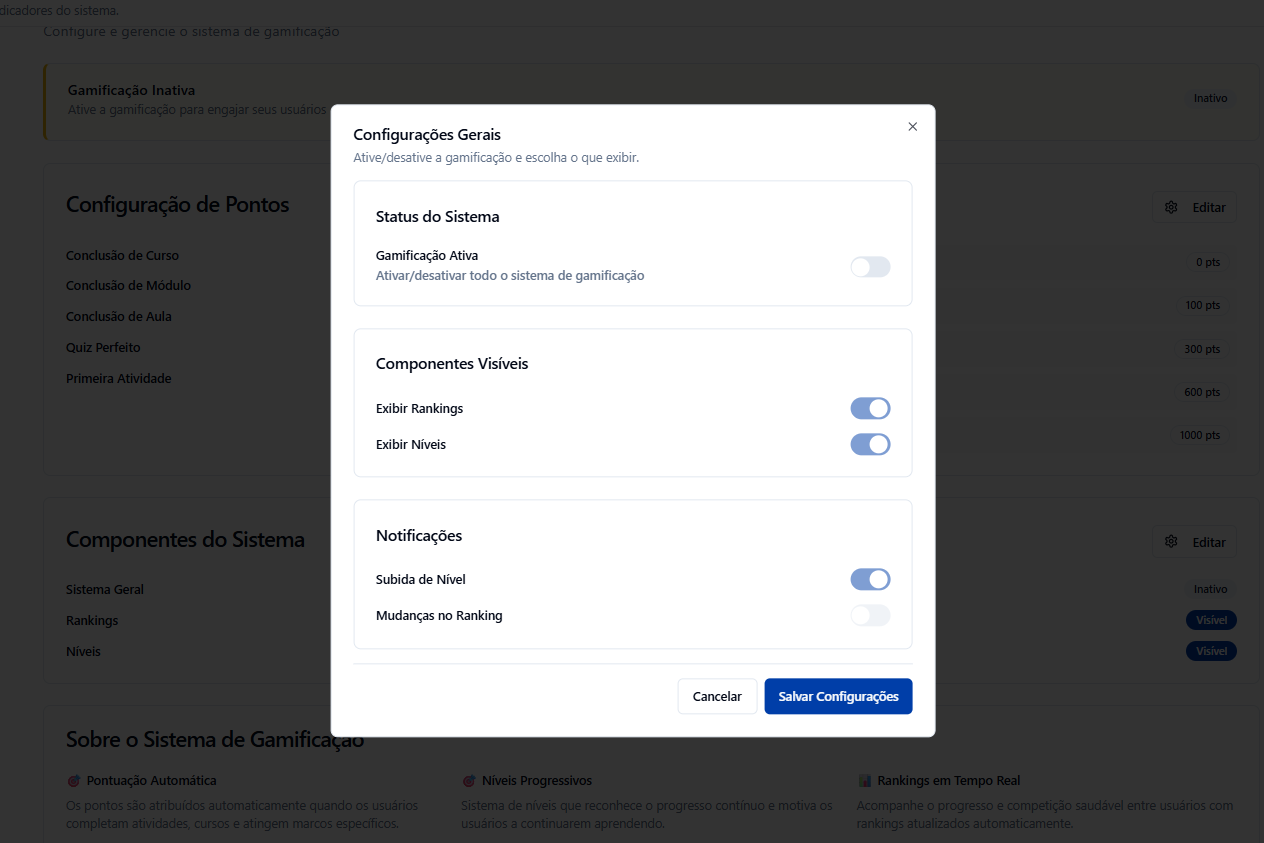 ⚠️ Atenção: Ao desativar a gamificação, pontos e níveis deixam de ser exibidos aos usuários. Os dados já gerados não são perdidos.