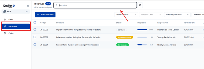 - A barra de busca fica no topo da tela de Iniciativas.