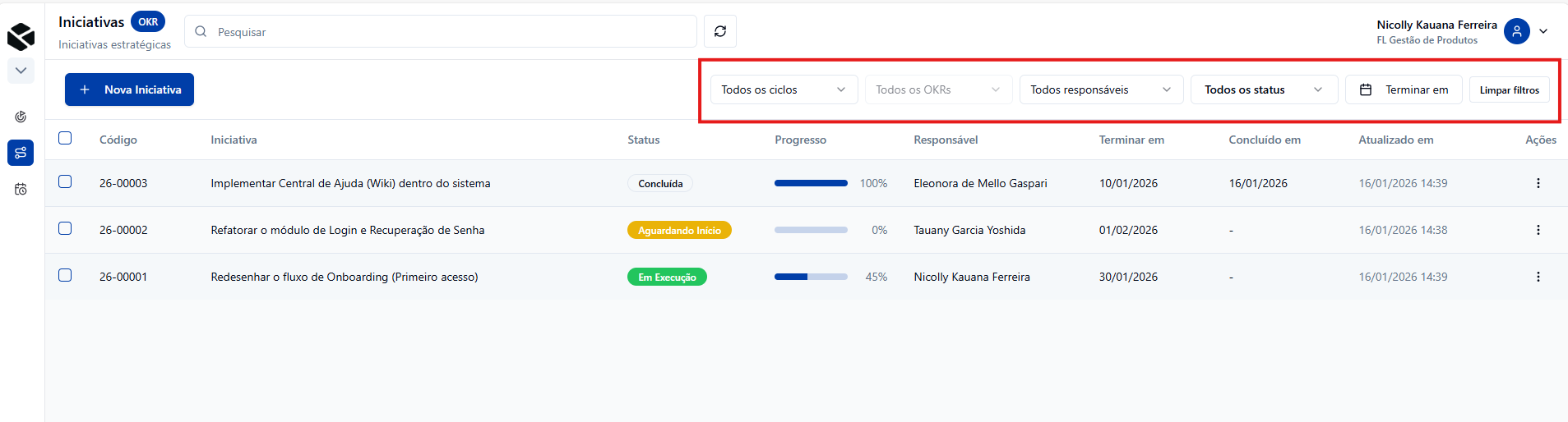 - Filtros detalhados: refinam a visualização por responsável, status, tags, ciclos ou OKRs.