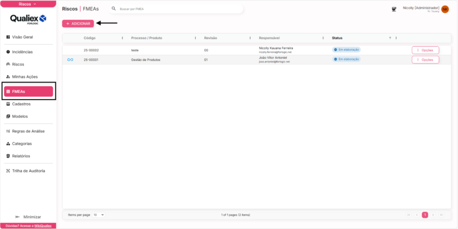 Para cadastrar um novo FMEA, localize e clique no botão "+ Adicionar " na tela principal do módulo. Uma nova janela se abrirá, onde você deve preencher as informações da análise.