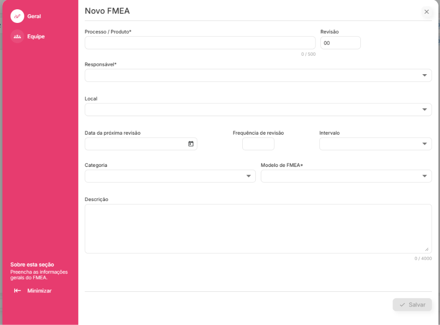 Após preencher, no mínimo, os campos obrigatórios da aba "Geral", clique no botão "Salvar" no canto inferior direito para concluir a criação do seu FMEA.