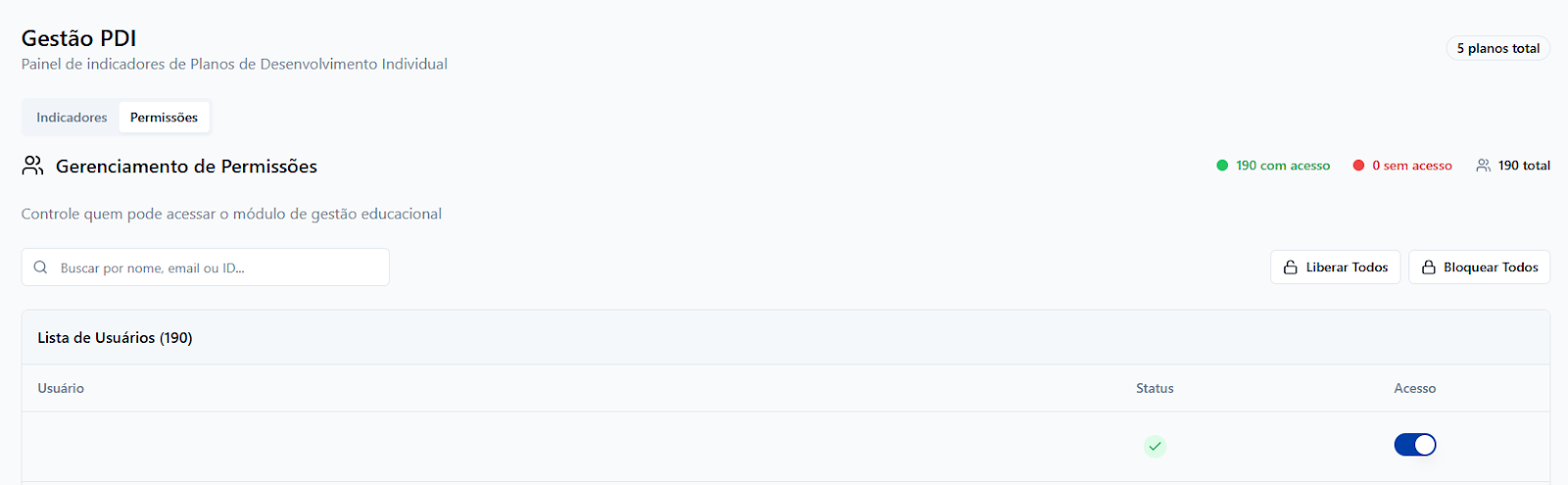 A aba Gestão é o painel administrativo e analítico do PDI.