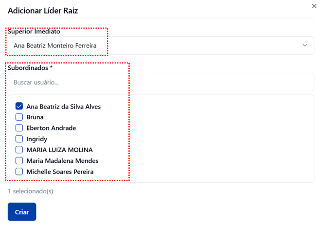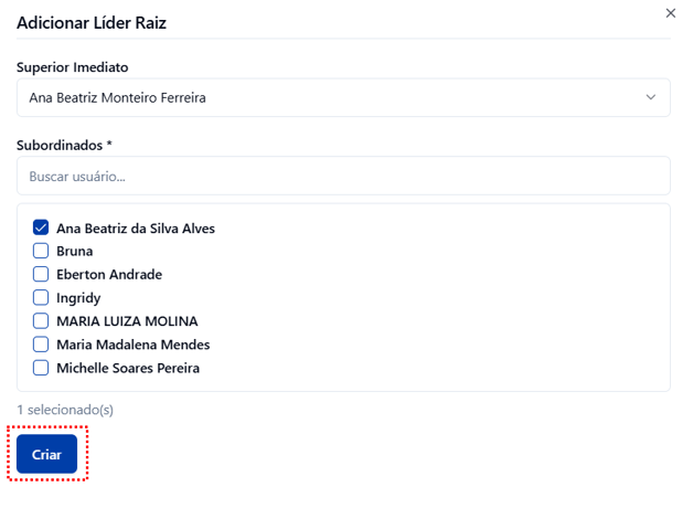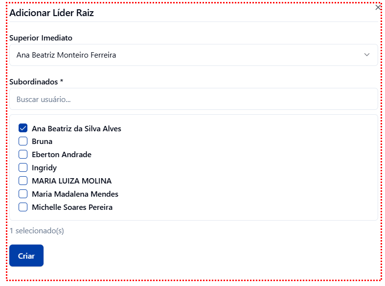 - Subordinados (Obrigatório): Marque na lista todos os colaboradores que respondem diretamente a este líder. Use a busca para facilitar.