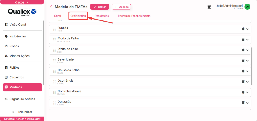 Nome da Criticidade: O nome que aparecerá no FMEA para classificar o risco (Ex: Baixa - Verificar necessidade de plano de ação).