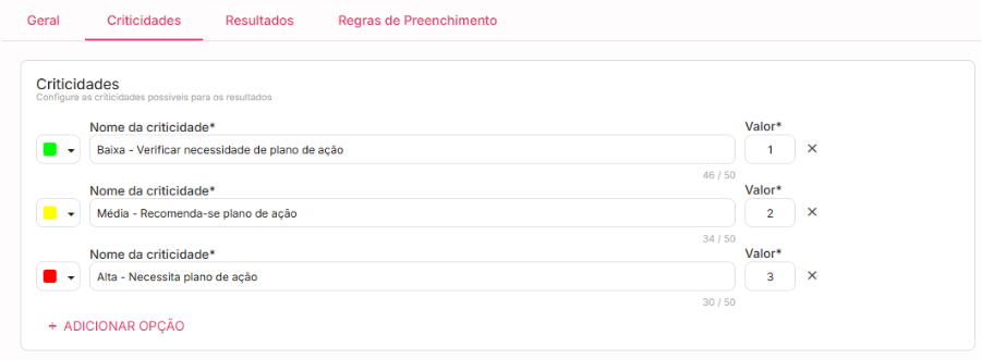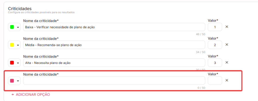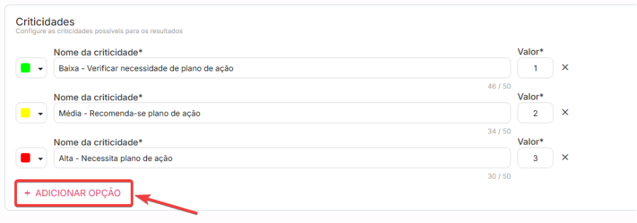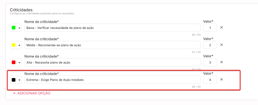 - Adicionar Nova Opção: Para isso, basta clicar no botão “+ADICIONAR OPÇÃO” abaixo da lista de criticidades.
