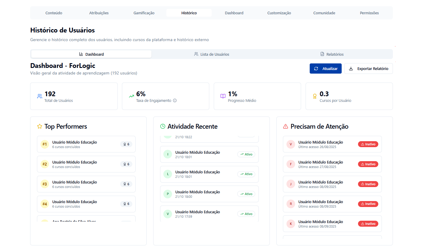 💡 Dica: Clique em Ver Histórico para abrir a visão detalhada de cada usuário, incluindo notas, cursos concluídos e datas de acesso.