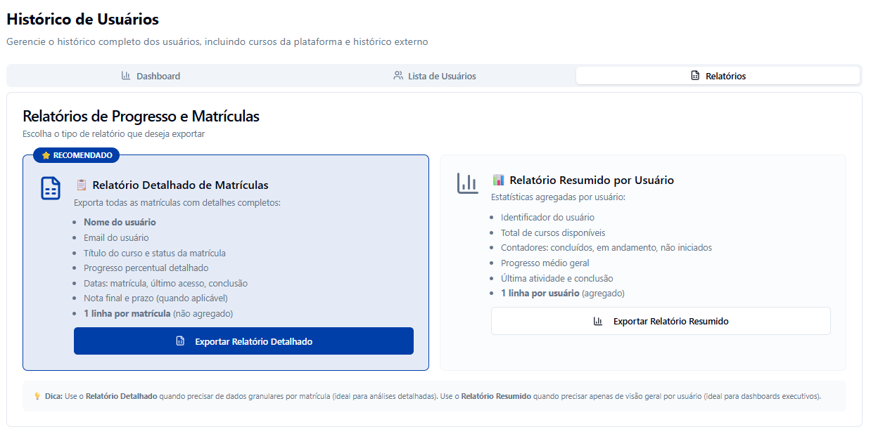 Na aba Relatórios, é possível exportar dados completos de usuários e matrículas, facilitando a análise e auditoria. Existem dois tipos principais de relatório: