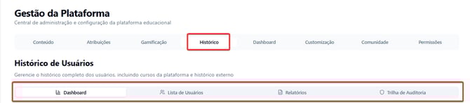 A aba Histórico permite acompanhar de forma completa a jornada de aprendizado dos usuários dentro da plataforma, reunindo informações sobre engajamento, progresso e exportação de relatórios. Essa seção é essencial para gestores que desejam monitorar resultados e otimizar ações de desenvolvimento corporativo.