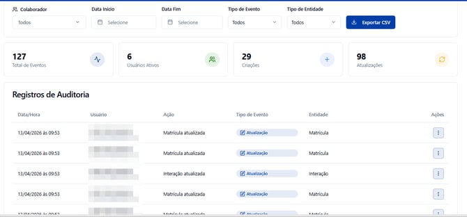 No topo da tela, você conta com filtros (por Colaborador, Data, Tipo de Evento e Entidade), cards de resumo rápidos (Total de Eventos, Usuários Ativos, Criações e Atualizações) e um botão para Exportar CSV.