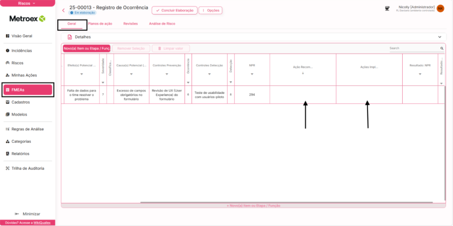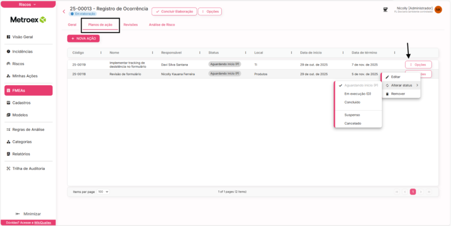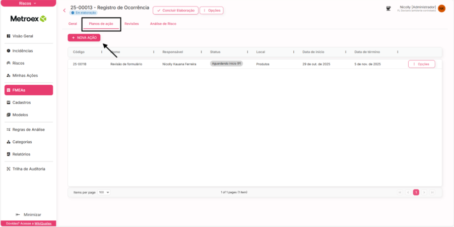 - Dentro do seu FMEA, clique na aba "Planos de Ação".