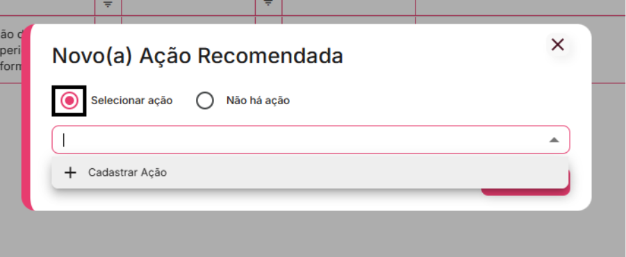 - O pop-up de seleção será aberto e você terá 2 opções: Selecionar ação ou Não há ação. Para cadastrar uma ação, a opção Selecionar ação precisa estar marcada.