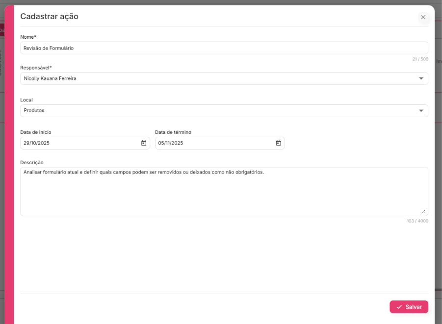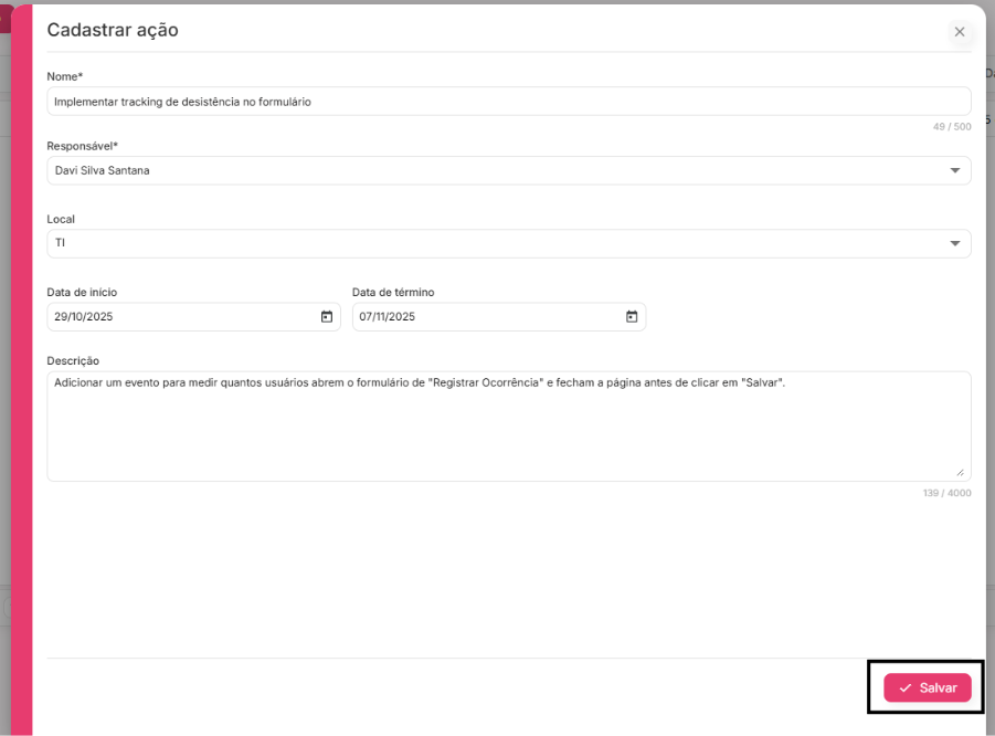 - Uma janela de "Cadastrar ação" será aberta. Preencha os detalhes da tarefa (Nome, Responsável, Datas, Descrição) e clique em "Salvar".