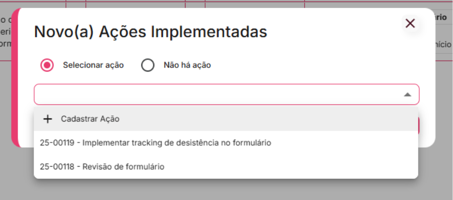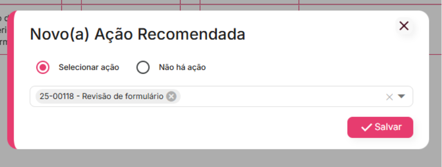 - Após salvar, o sistema voltará para o pop-up de seleção, mas agora com a sua ação recém-criada (ex: "25-00118 - Revisão de formulário") já selecionada no campo. Apenas clique em "Salvar" neste pop-up.