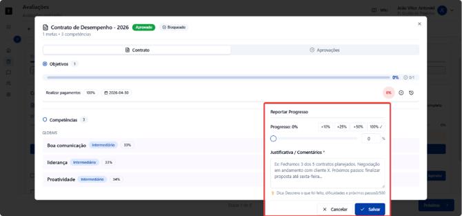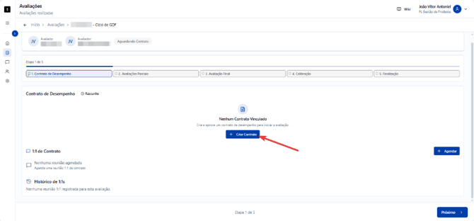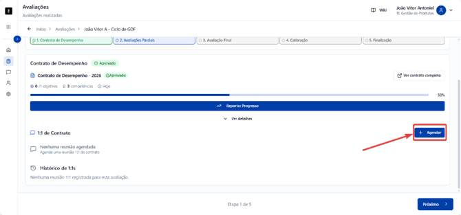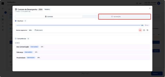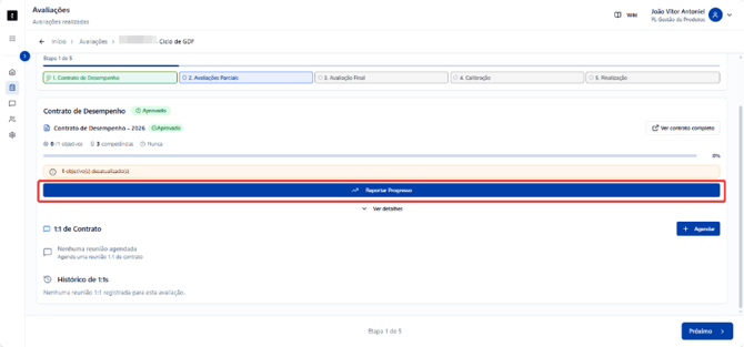 Ao abrir a avaliação de um liderado, você verá uma barra de progresso no topo. Certifique-se de estar na aba 1. Contrato de Desempenho.