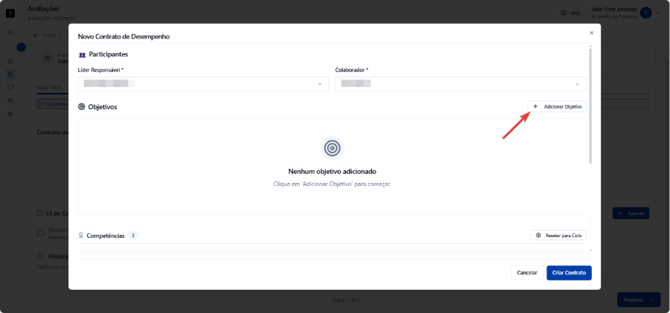 - Na janela que se abrir, a seção de participantes já virá preenchida. Vá direto para a seção Objetivos e clique em + Adicionar Objetivo.