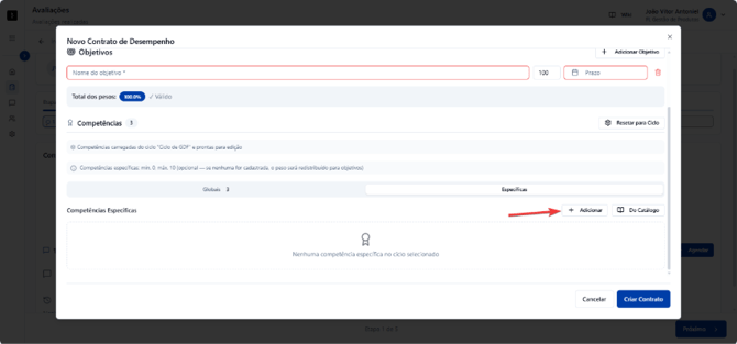 Após a avaliação de desempenho ser gerada no sistema, o primeiro passo prático do gestor é formalizar o "Contrato de Desempenho". É nesta etapa que você define as regras do jogo para o ciclo atual: quais serão os objetivos do colaborador e quais competências serão avaliadas.