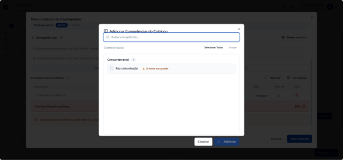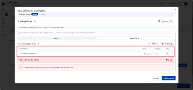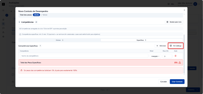 - ⚠️ Atenção aos Pesos: O sistema é rigoroso com a matemática! Garanta que a soma de todos os pesos dos objetivos e competências chegue a exatos 100%. O validador na tela avisará quando a soma estiver correta.