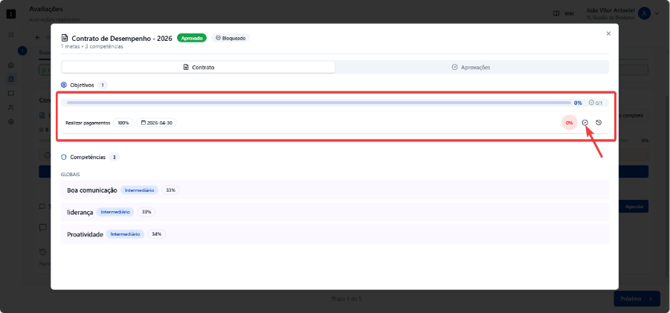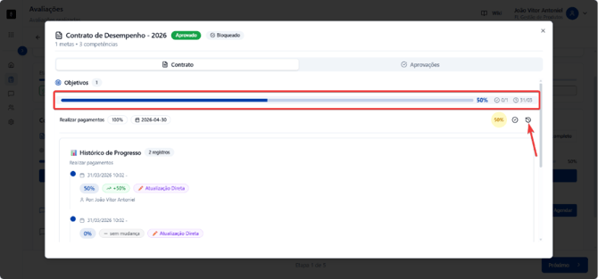 Na janela do contrato, vá até a linha do objetivo que deseja atualizar e clique no ícone de check (um círculo com um visto dentro) ao lado da porcentagem atual.