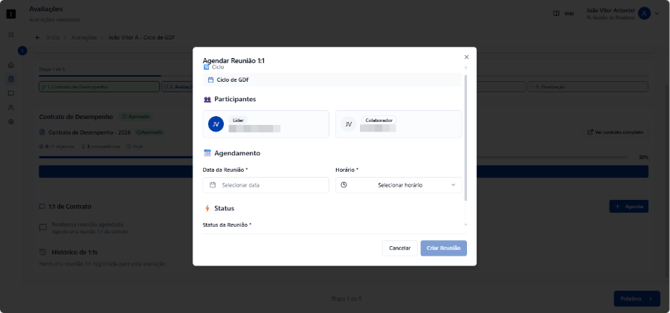 - Não pule a 1:1: A avaliação de desempenho funciona melhor através do diálogo. Use a ferramenta de agendamento do sistema para garantir que o colaborador saiba exatamente o que está sendo esperado dele antes de vocês clicarem no botão de "Aprovar".