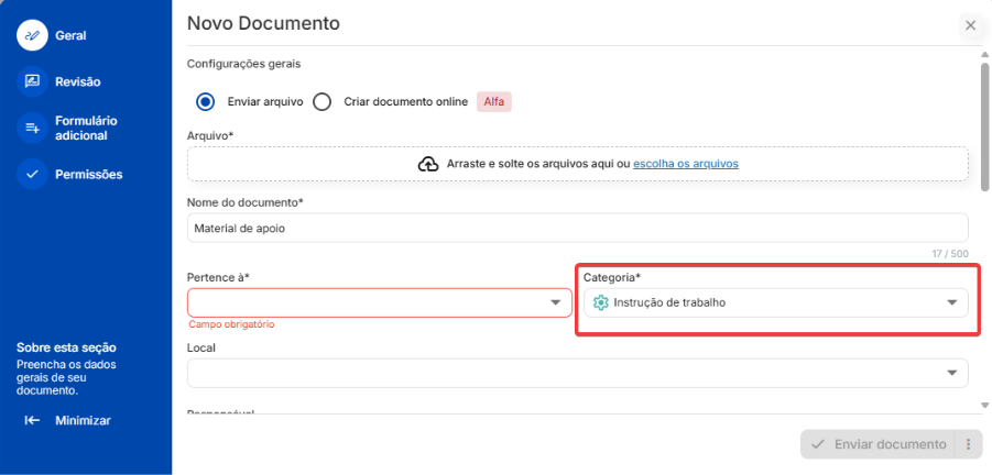Existem casos em que a regra geral da Categoria não se aplica ao documento que você está criando. O sistema permite que você configure isso manualmente.