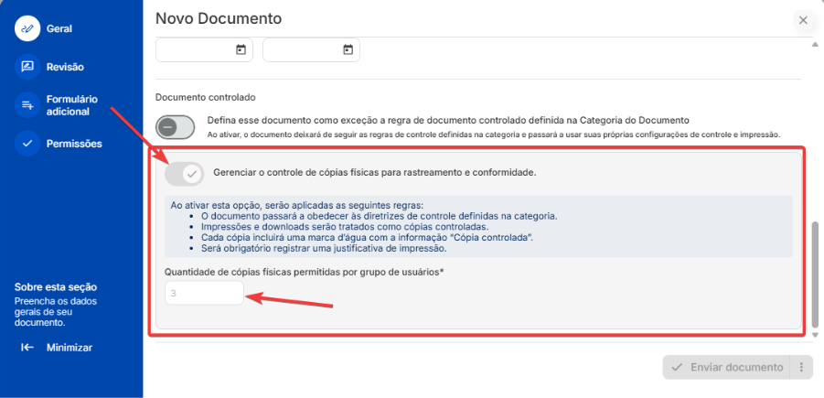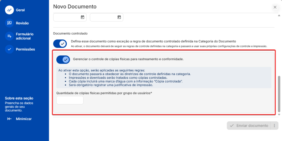 - Documento controlado: Ative a chave para impor marca d'água e rastreio, ou desative para desativar.