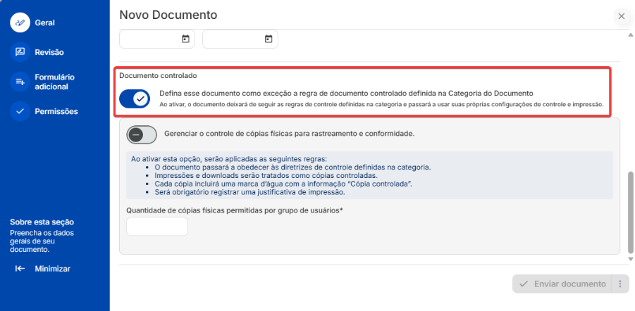 - Se a Categoria foi configurada como "controlada", o documento já vem com a configuração de controle ativada.