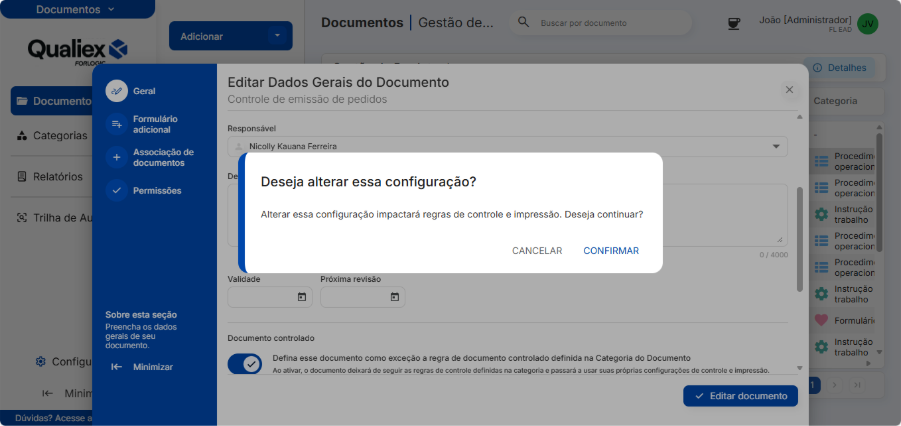 Se você estiver editando um documento que já está vigente e tentar alterar essa configuração, o sistema exibirá um alerta de confirmação.