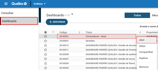 , você pode editar, duplicar ou remover essa dashboard.