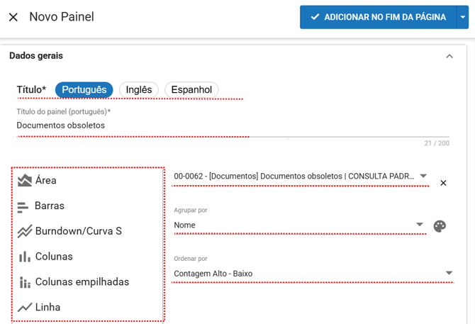 É possível inserir o título em Português, Inglês e Espanhol, garantindo que o painel seja exibido corretamente para usuários que utilizam outros idiomas no sistema.