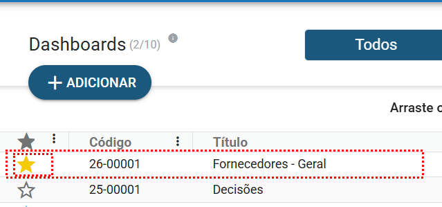Temos a opção de favoritar a sua dashboard. Quando uma dashboard é marcada como favorita na listagem, ela passa a aparecer em primeiro lugar e com o símbolo de favorita