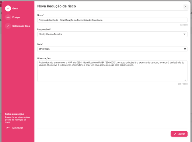 - Uma janela de cadastro ("Nova Redução de risco") aparecerá. Ela tem 3 abas que você precisa preencher antes de salvar: