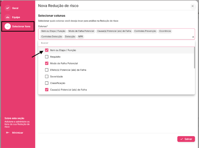 - Aba Selecionar itens: Escolha quais colunas e linhas do FMEA original você quer trazer para esta análise.