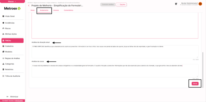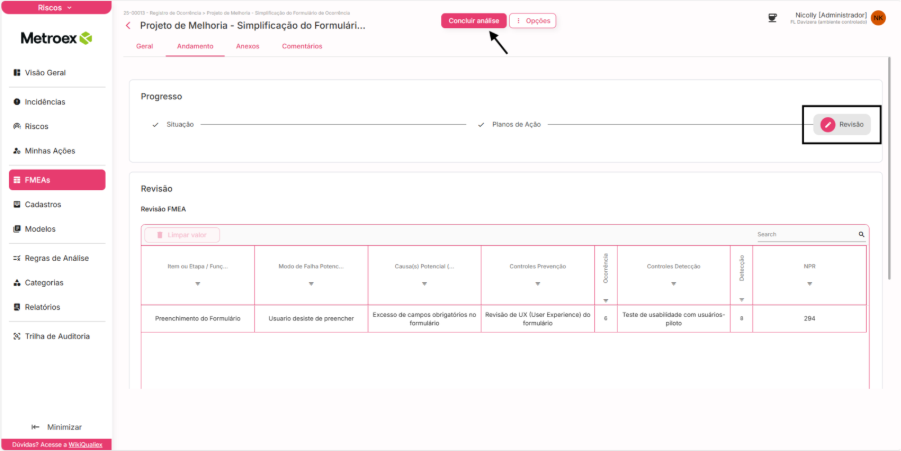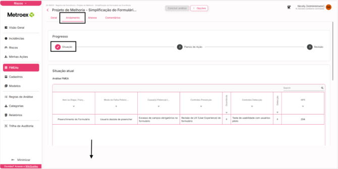 - Próximo Passo: Para que o status mude para "Concluído", o sistema precisará atualizar esses valores no FMEA original através da funcionalidade “Carregar modificações para FMEA".