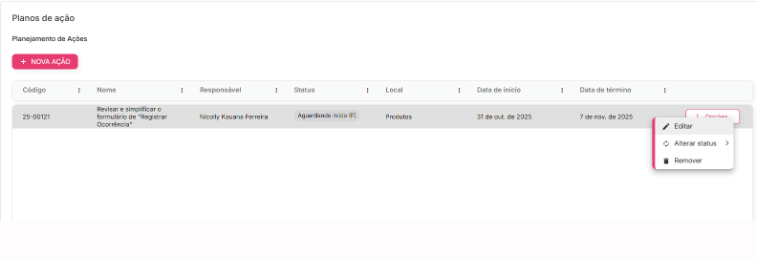 - A ação aparecerá na lista. Você pode usar o menu "Opções" ao lado dela para editar, excluir ou alterar o status conforme a equipe trabalha nela.