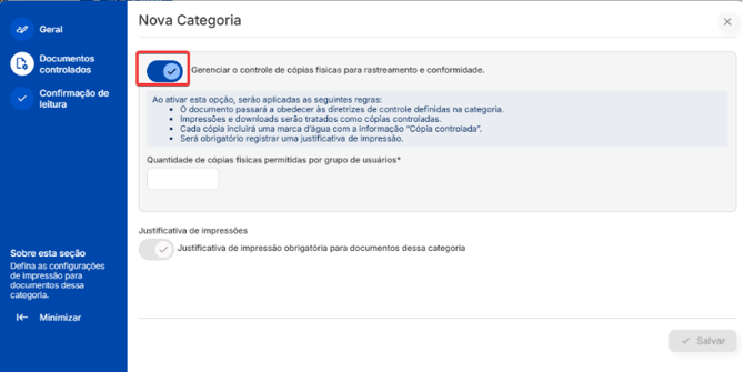 Observação: Se a opção de "documentos controlados" para essa categoria, ainda é possível habilitar apenas a apenas de "justificativa". Mas quando a opção de "documentos controlados" estiver ativa, sempre será obrigatório resgitrar essa justificativa, ou seja, não sejá possível habilitar o primeiro botão e desabilitar o segundo, eles vão caminhar juntos (se o primeiro estiver ativo).