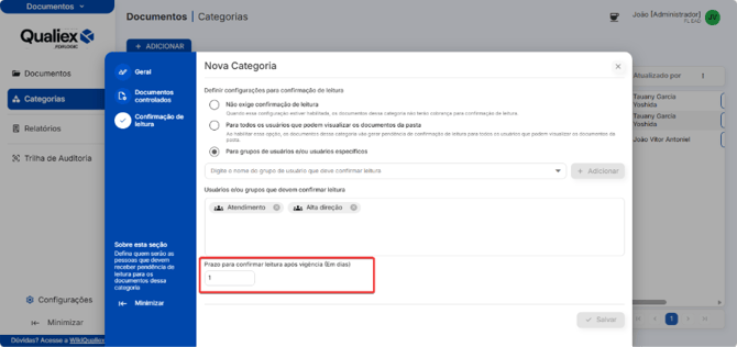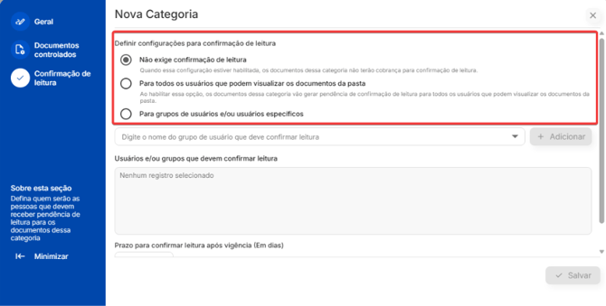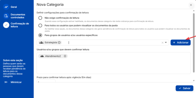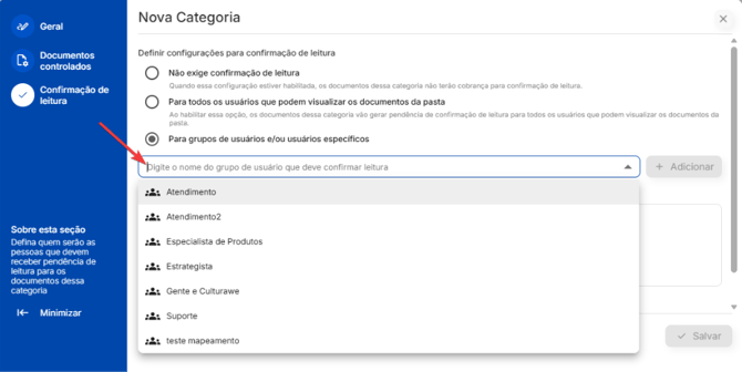 - Selecione um ou mais grupos de usuário que devem confirmar leitura nos documentos dessa categoria