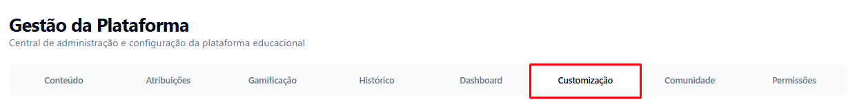 O que a Customização faz? Centraliza ajustes de aparência e navegação (itens do menu, cores, logo, fonte e layout do banner). As mudanças afetam todos os usuários da universidade.