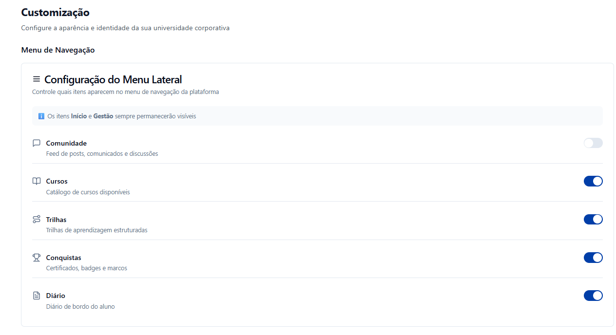 - Itens opcionais: Comunidade, Cursos, Trilhas, Conquistas e Diário podem ser ligados/desligados individualmente (switch à direita).
